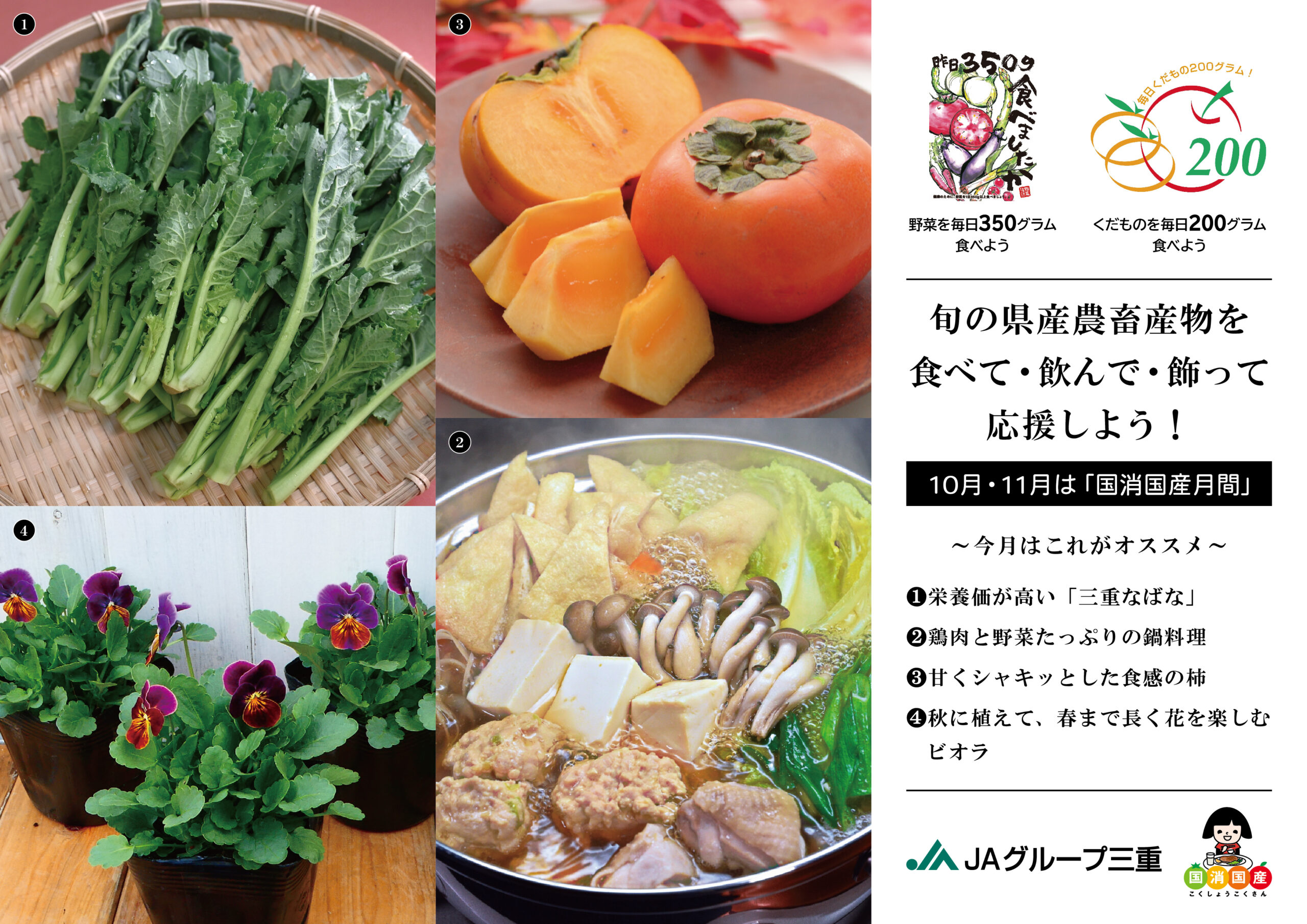 地元農畜産物を「食べよう」、「飲もう」、「飾ろう」! 2025.10.23 JA三重中央会 中央会・連合会 新着情報 JAグループ三重では、当ホームページやポスターを通して旬の農畜産物を紹介しています。 地元の新鮮でおいしい農畜産物を知って、食べて、飲んで、飾って、健康で元気な体を作りましょう。