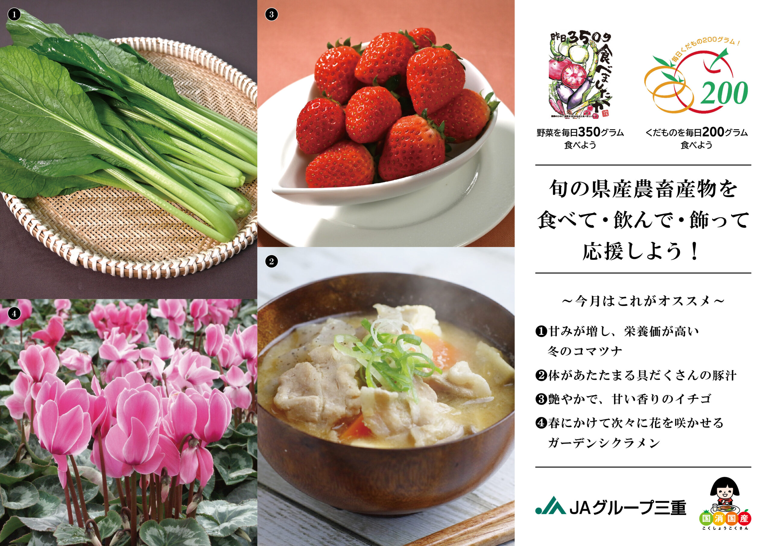 地元農畜産物を「食べよう」、「飲もう」、「飾ろう」! 2026.02.17 JA三重中央会 中央会・連合会 新着情報 JAグループ三重では、当ホームページやポスターを通して旬の農畜産物を紹介しています。 地元の新鮮でおいしい農畜産物を知って、食べて、飲んで、飾って、健康で元気な体を作りましょう。